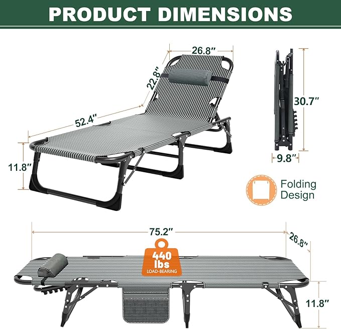 - DESIGNED FOR COMFORT: With a perfect balance of a firm and soft surface, our chaise lounge boasts an ergonomic design to help reduce muscle tension and stress; The beach lounger chair has a side pocket, to place your phone, books or keys; the pillow is detachable, can be adjustable up and down or removed based on your own needs;