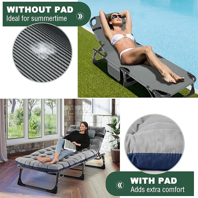 - MULTI PURPOSE: Tri-fold storage design for easy transport and store. This cot will be an excellent choice for Relaxing on Your Next Road Trip, at Home, the Pool, Lake, RV, Campsite, Patio, Deck, Tent or Cabin;