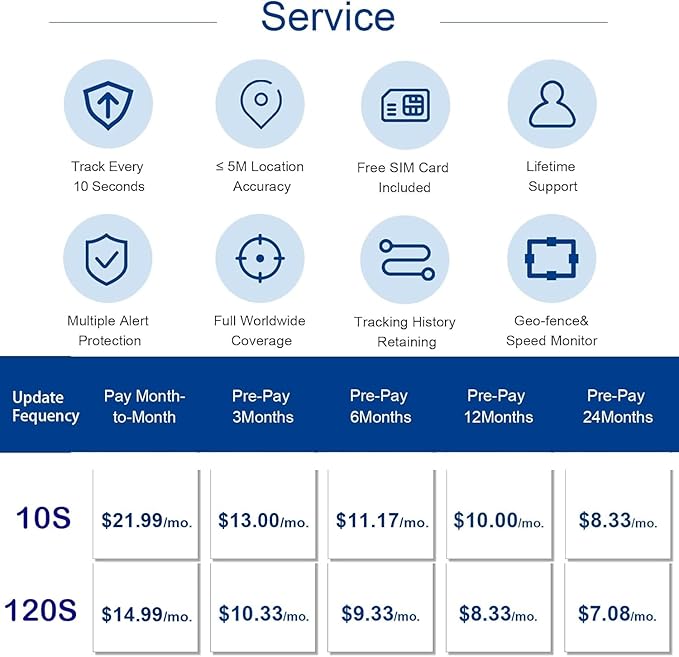 - Budget-Friendly Subscription: Enjoy industry-leading GPS tracker with our low-cost subscription - only $14.99/month, or as low as $7.08/month with long-term plans. No hidden fees. Cancel anytime. Lifetime Warranty