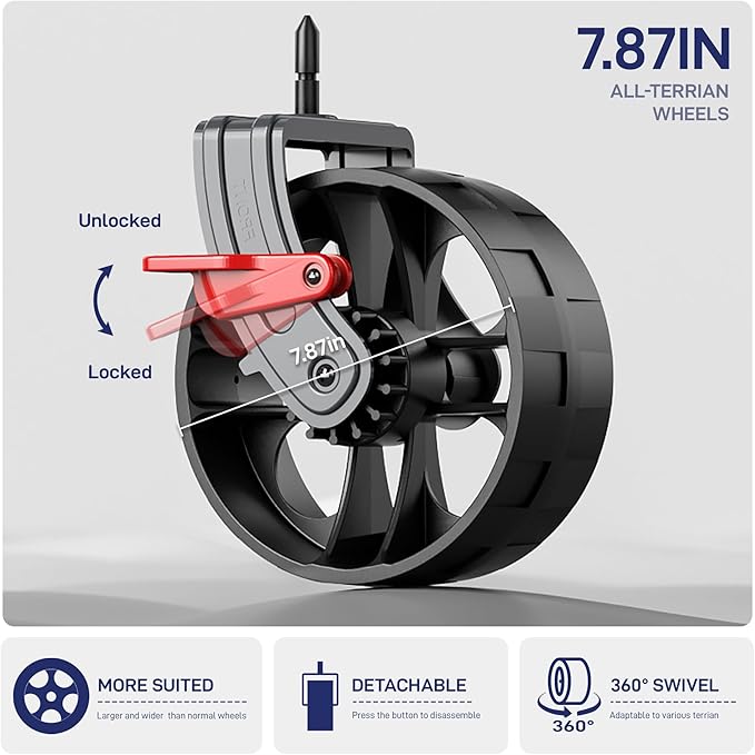 - ALL-TERRAIN WHEELS: Large all-terrain wheels, wider than normal wheels. Front wheels can rotate 360 degrees and both are equipped with brakes. The universal wheels make it easy to turn in the direction where you want to go. The quick-release wheels help you to store the folding shopping cart quickly. A special process is used to make it more stable and produce less noise