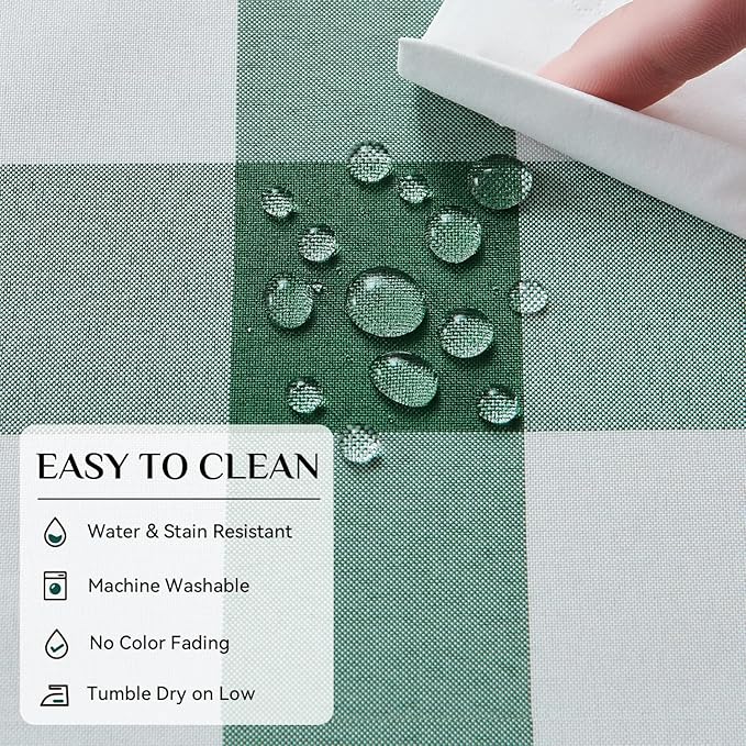- SPILLPROOF and STAIN RESISTANT: Featuring a fade resistant fabric, the gingham pattern tablecloth is specially treated to be 90% waterproof. Liquids and wine can be easily wiped clean with a damp cloth.