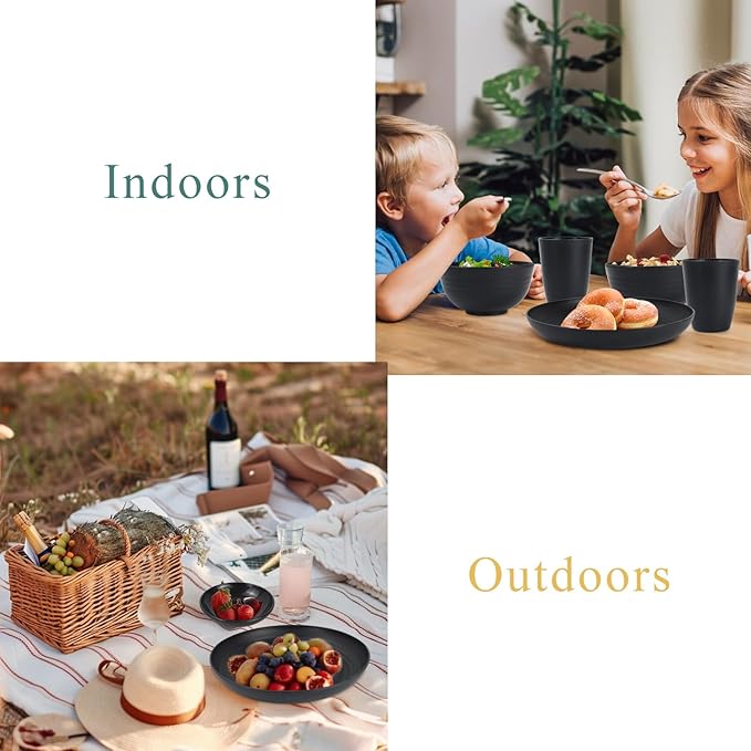 Wheat straw dinnerware sets of 16-10 inches plates,26oz bowls,2oz dipping bowls,12ozcups - Unbreakable plates and bowls sets microwave safe and dishwasher safe,service for 4. Black