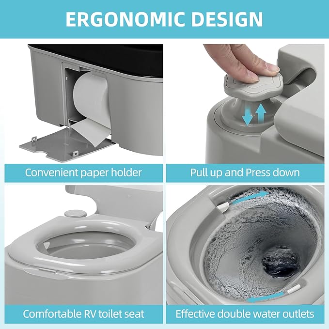 - EFFICIENT CLEANING DESIGN: The portable toilet for camping is equipped with double water outlets, ensuring more dispersed and effective cleaning of stains in hard-to-reach corners; The handle pump allows for effortless pressurization and flushing of the travel toilet