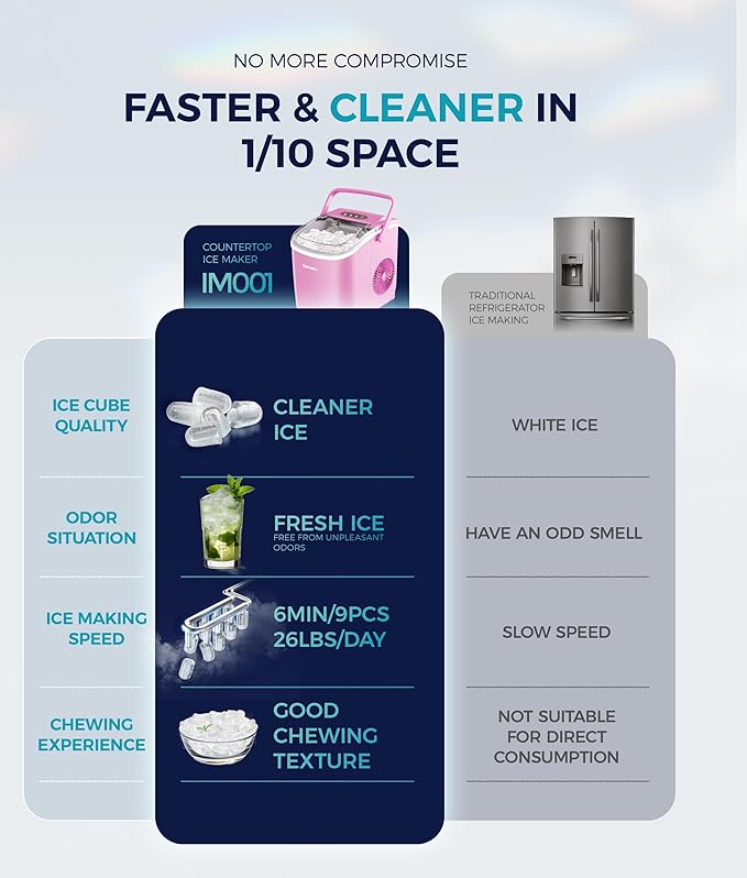 - Smart Operation & Self-Cleaning: The ice maker has advanced infrared sensor. The "ICE FULL" indicator flashes remind you to take out ice to prevent overflowing when the basket is full. And it'll remind you to add water by flashing "ADD WATER". Additionly, the compact ice maker has a one-touch auto-cleaning function. Press the “ON/OFF” for 5s after adding water to run automatic mode for 30mins. Not only are your hands-free but also you get a clean ice maker.