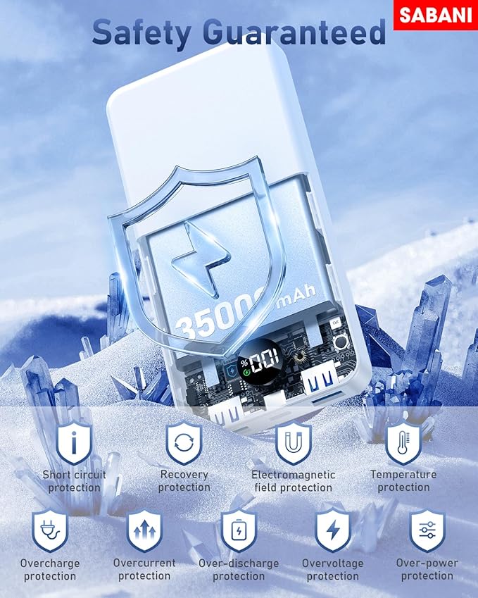 - Safe and Reliable Battery Pack: SABANI portable battery has 10 layers of multiple system protection, built-in low-temperature IC ice core, intelligent monitoring of voltage and current, actively avoid over-charge, over-discharge, short circuit, high temperature and a series of potential dangers, creating a safe charging environment for you. What You Get: 1*35000mAh Portable Charger with 4 built-in Cables and 3 Ports, 1*USB C Cable for Recharging Portable Charger, 1*User Manual.