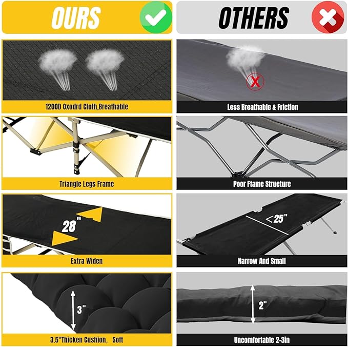 - 【Breathable 1200d Material And Removable Mattress】Camping Cot is made of dual-sided 1200D oxford skin-friendly and comfortable fabric with 3" thick and high-quality cotton filling.More breathable and soft than others,also easy to clean.You won't feel any pain lying on it,bring you comfortable night or outdoor sleep.Beides,mattress can be removable,so you can use cot in summer,suitable for all seasons