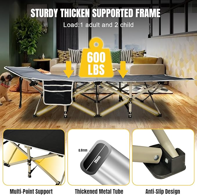 - 【600Lbs Capacity Supported Frame】Foldable cot bed is constructed with triangular shape,10 tubular iron legs,25mm thickened oblate square tubes,and each foot support are equipped with anti-slip pads,enhance cot bed stability and durability to achieve best max support.Folding bed can withstand 600 LBS.One folding cot easily solves the family's out-of-town travel rest