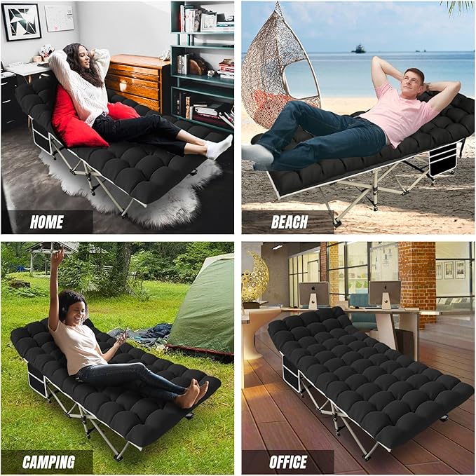 - 【Widely Application】Cot has a large built-in side pocket to store your phone,glasses,toys and more.Ideal for daily or travel use for families with adults and children.Including outdoor camping,office napping, travel,beach,patio,offering relaxation anytime, anywhere.