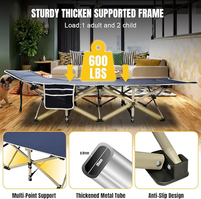 - 【600Lbs Capacity Supported Tubular Frame】Foldable cot bed is constructed with triangular shape,10 tubular iron legs,25mm thickened oblate square tubes,and each foot support are equipped with anti-slip pads,enhance cot bed stability and durability to achieve best max support.Folding bed can withstand 600 LBS.One folding cot easily solves the family's out-of-town travel rest
