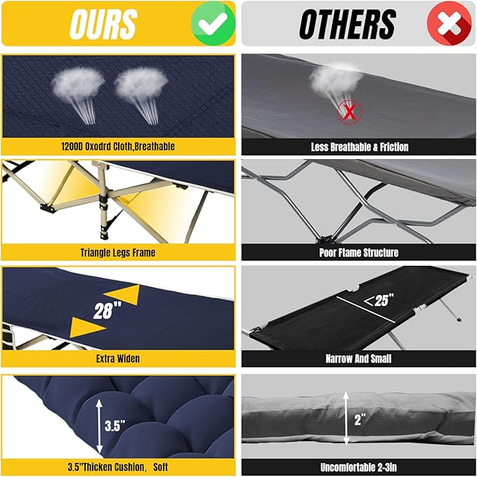 - 【Breathable 1200d Material And Removable Mattress】Camping Cot is made of dual-sided 1200D oxford skin-friendly and comfortable fabric with 3.5" thick and high-quality cotton filling.More breathable and soft than others,also easy to clean.You won't feel any pain lying on it,bring you comfortable night or outdoor sleep.Beides,mattress can be removable,so you can use cot in summer,suitable for all seasons