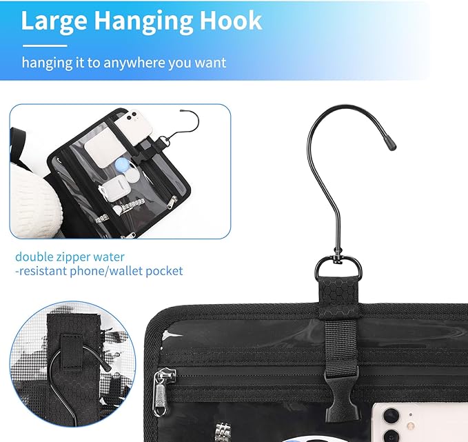 - 360° Metal Hanging Hook --- The hook design allows you to place your toiletries in a room that without enough space. The large hook makes the placing unlimited. Hanging the toiletry bag to anywhere you want with the 360° large hook. You can hang it on the door, wardrobe or shelf.