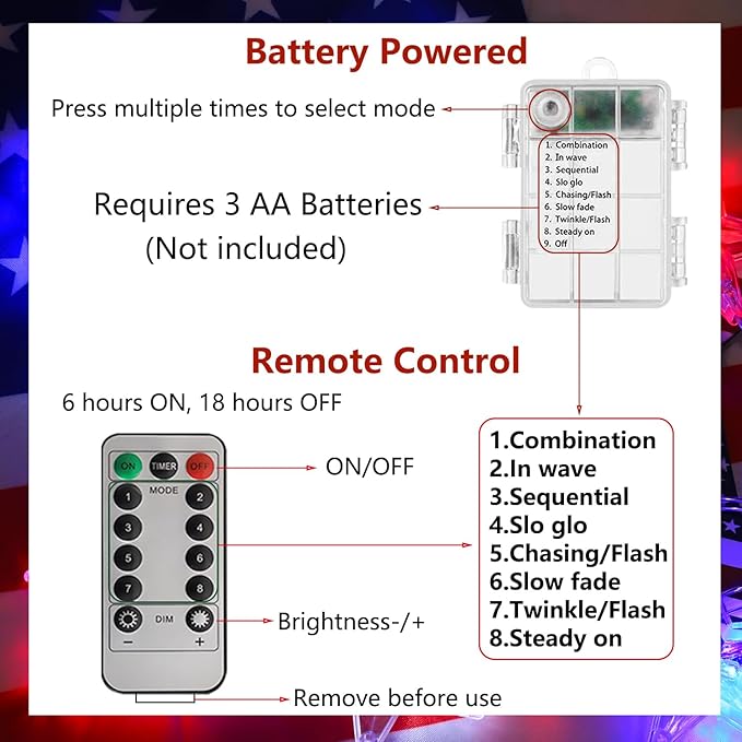 - 2.String Lights with Remote Control - Point the remote to the string lights, you can control the lights ON, OFF and lighting modes. And there are 8 different modes (combination, sea wave, sequence, Slo-Glo, chase/flash, slow fade in, blink/flash, steady light up) can be controlled by the button on the battery box.