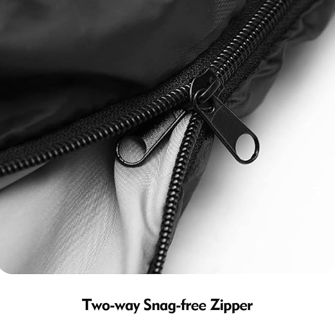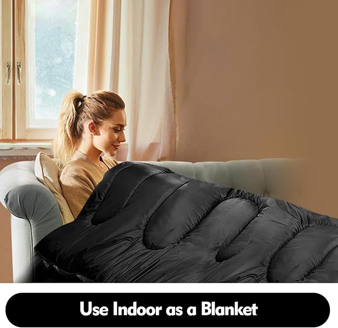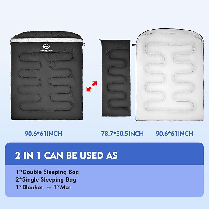 - VERSATILE SLEEPING SOLUTION -- Our double sleeping bag can be easily separated into two individual sleeping bags or transformed into 2 queen-size blankets, thanks to the wraparound zippers. Whether you're enjoying the outdoors or using it indoors, this adult sleeping bag will keep you warm and provide a comfortable sleeping experience.