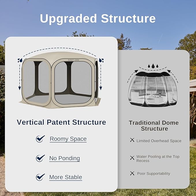 - ๐ฅ๐ผ๐ผ๐บ๐ ๐ฆ๐ฝ๐ฎ๐ฐ๐ฒ & ๐จ๐ฝ๐ด๐ฟ๐ฎ๐ฑ๐ฒ๐ฑ ๐๐ฒ๐๐ถ๐ด๐ป: This screen house frame is made of durable 300D Oxford fabric and rust-resistant steel structure. The top structure is supported by heavy-duty fiberglass, which prevents water from accumulating and delivers more space. The zipper can be used on both sides, and its connection with the tent is upgraded with doulble stitching, making it less likely to tear. The door curtain can befixed to the side for easy access