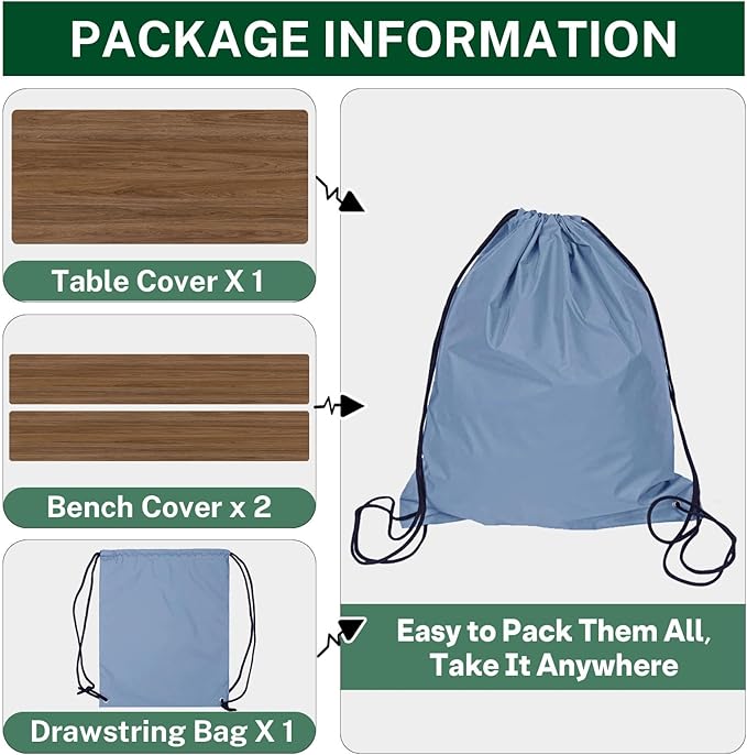 - Waterproof and windproof: Our picnic table and bench covers have elastic bands around them, so it can be firmly fixed on the table without sliding and there is no need to bring another tablecloth clip.
