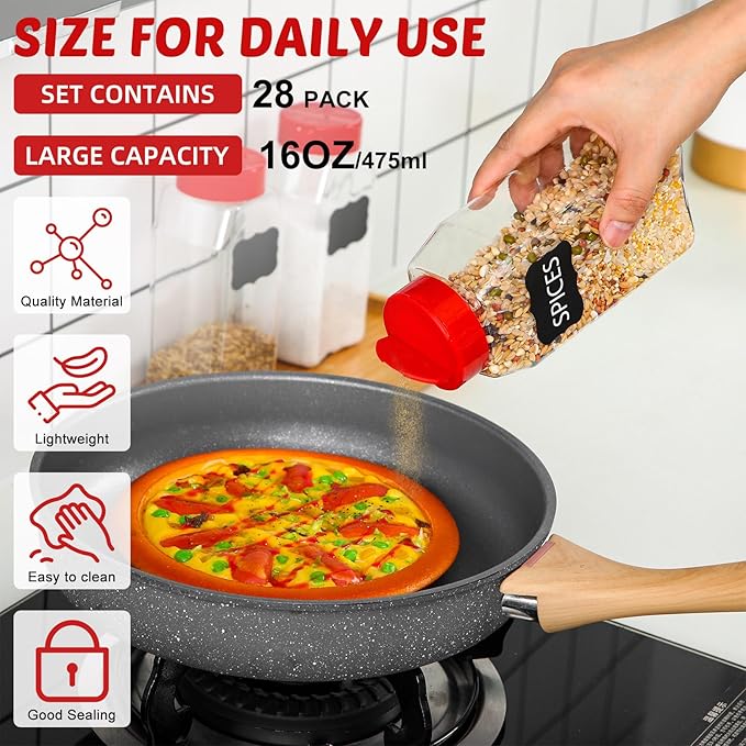 - Convenient Pack: this package comes with 28 pieces of 16 oz square plastic spice jars with shaker lids, equipped with 4 sheets of black stickers (each sheet has 8 pieces, a total 32 pieces) for easy identification, this count offers you an ample supply for your daily need, creating uniformity in your spice storage while ensuring you have enough storage for most of your spices