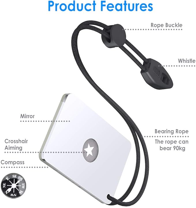 - MULTI-FUNCTION signal mirror survival kit: Signal mirror survival, Whistle for help, Compass,Load-bearing rope. Multifunctional outdoor distress tool.Ideal for cars, outdoor adventures, mountain climbing, camping, hunting, fishing, extreme sports, ultimate survival technologies, etc.