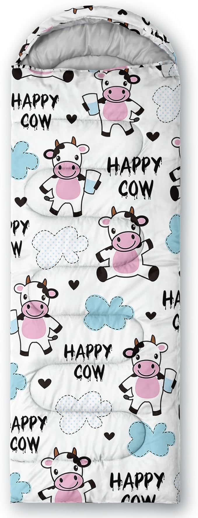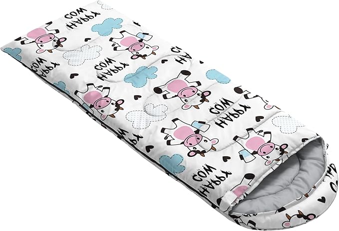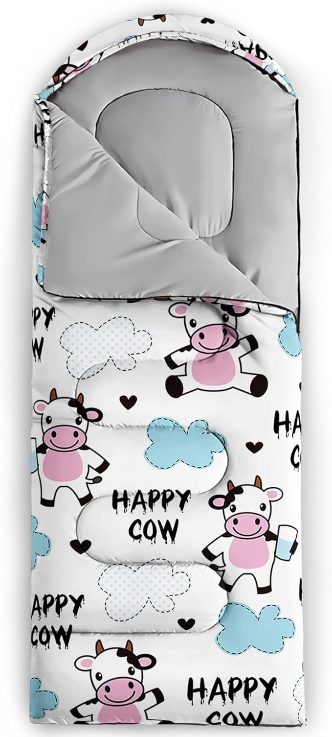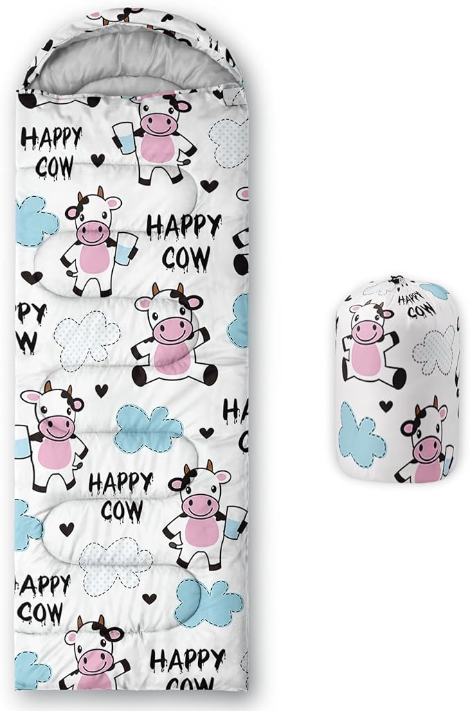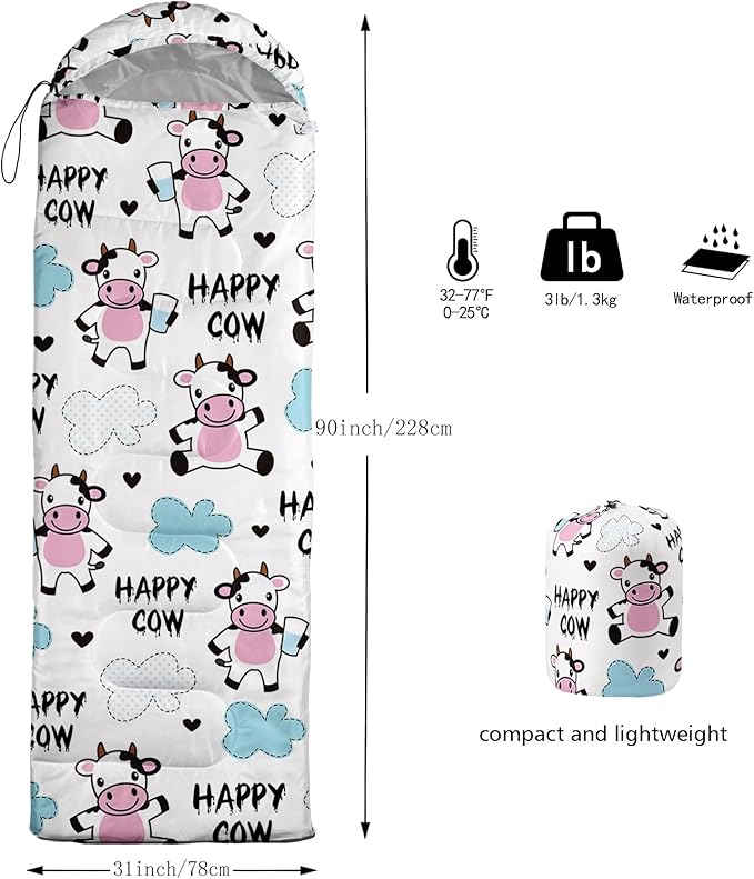 - 【Fits For 3 Seasons】: Size - 31 by 90 inches (W x D). Our Cartoon Milk Cow sleeping bag can be used in 3 seasons with a design temperature of 32℉-77℉(0℃-25℃). These Sleeping bags also have a weather resistant waterproof design to keep you warm and prevent you from any dampness.