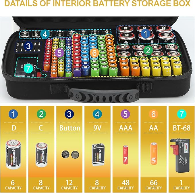 - ๐ใHigh-quality Materialsใ Made of hard EVA material,with shock-resistant and shockproof.Detachable insert foam with well cut holes fits different-sized batteries snugly, also can tightly fix all batteries in the groove, avoid the friction between batteries.Battery case organizer with hard shell, smooth zipper, firm handle and thick foam slot is perfect for holding battery. Keep your triple a batteries organized and safe in one place, keeping them neat and dry. Battery bag give your aaa batteries a long lifespan.