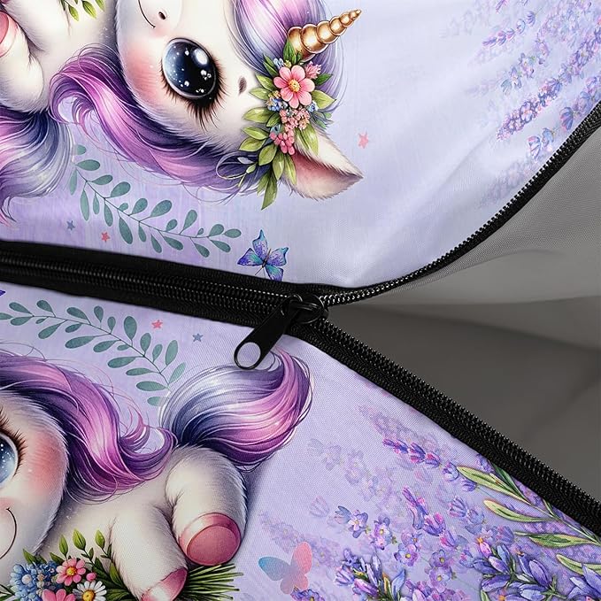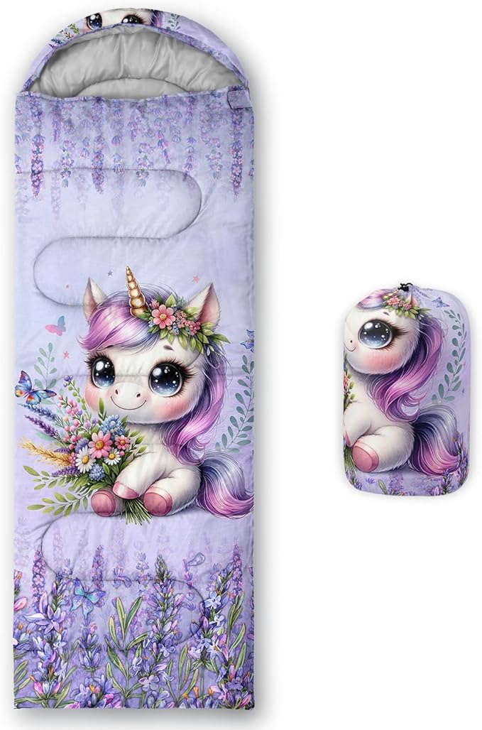 - 【Fashion Design】This waterproof and lightweight sleeping bag is designed with a cartoon unicorn pattern.The unicorn holds flowers and is surrounded by butterfly flower bushes,adding a comfortable atmosphere.It is very suitable for use during spring camping.
