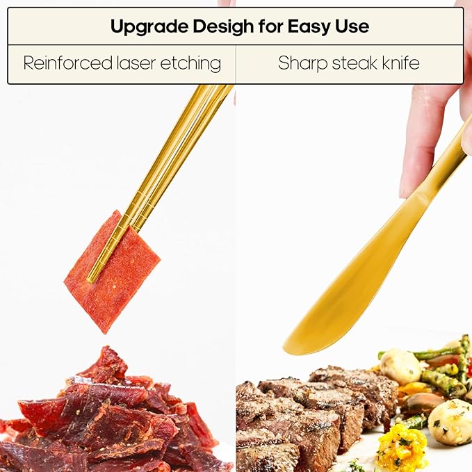 - 5 PCS Utensils Set: The minimalist set comes with an adult-sized fork, spoon, knife, chopsticks, and carrying case. The chopsticks are desighed with reinforced laser etching, for better anti-slip and grab the food