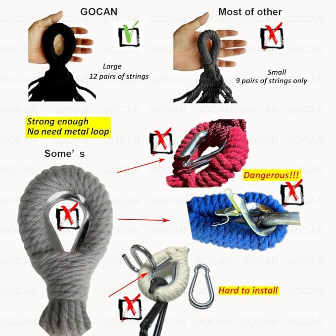 - 【3】Holds Up To 500 Lbs: The handcrafted knots at both ends and solid fabric are strong enough to holds up to 500 lbs. It is safe for couples, children and pets to relax or take a nap, the metal ring inside each end offers extra durability for long time using.
