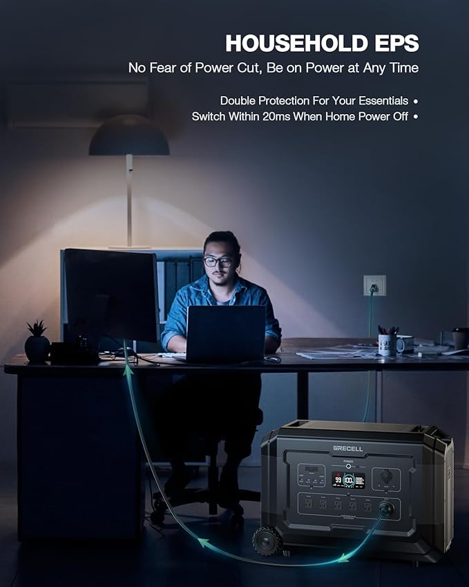 - SEAMLESSLY EPS BACKUP:S5 4000w portable power station is equipped with less than 20ms EPS to ensure the safe operation of PS5, CPAP, fish tank, refrigerator, self-service feeder or desktop computer when sudden power failure, offering 24/7 protection for sensitive electrical devices against power disturbances or grid failure. Perfect for home emergencies, network equipment, and outdoor tasks requiring uninterrupted power supply.