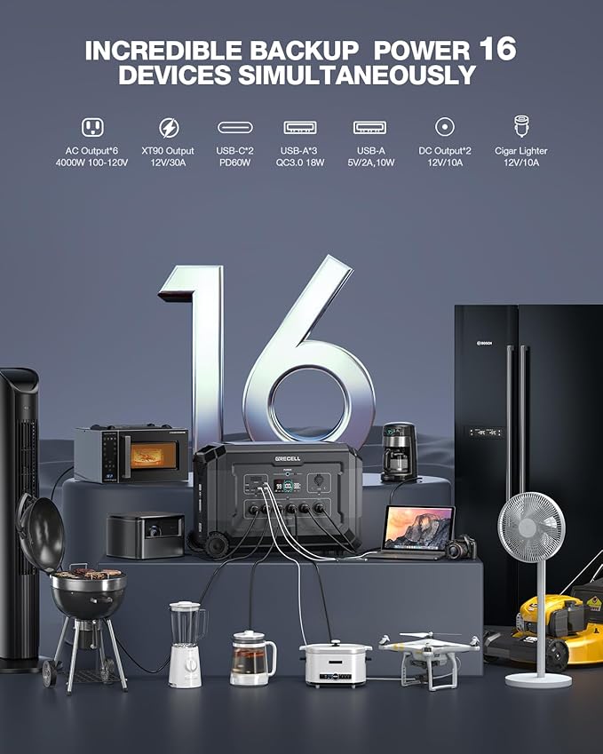 - ONE POWERS ALL: GRECELL S5 power station includes 16 outlets -- 6*AC outlets, 4*USB-A ports, 2*USB-C ports, 2*DC ports, 1 XT90 port and 1 cigarette lighter. With a vast 5040Wh capacity and massive 4000W power output, it supports 99.9% of home appliances- electric vehicles, TV, coffee maker, air conditioner, toaster, microwave oven, CPAP, drill, Juicer, hair dryer,etc. 30A RV outlet offers massive power for your RVs or travel trailers and is very suitable for long-distance travel.