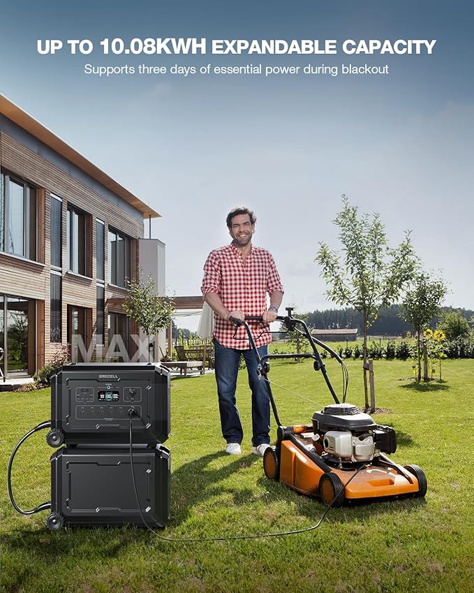 - EXPAND YOUR POWER AT WILL: UP TO 10.08KWH! With a extra battery(not included), the GRECELL huge capacity solar generator can expand from 5.04kWh-10.08KWh for battery backup power supply, which is enough energy to power a typical household for several days. Once connected, they’ll charge/discharge in unison, keeping the battery percent level across both units. Without doubt, it will be the best choice for household electricity storage and easily replacing the Gasoline/Fuel generator.