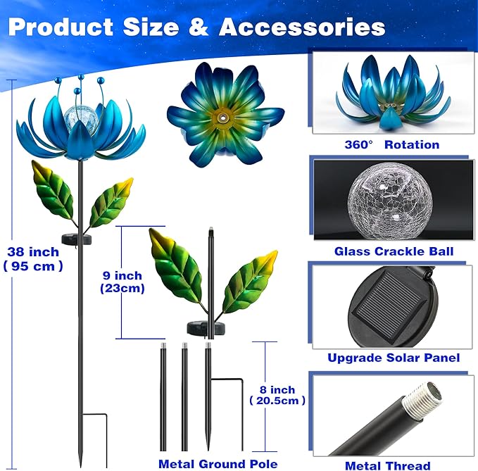 - 【 Solar Wind Spinners Outdoor 】Purple lotus flower lights wind spinner using waterproof LED burst spherical glass flower lights.It is beautiful and cute, it can decorate any place in the garden, it is beautiful during the day and at night, you can easily place and move it to any place you like!