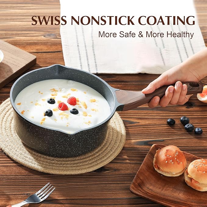 - Glass Lid & Stay-cool Handle - Long-lasting tempered glass lid makes this induction saucepan with lid convenient to see the cooking status and limits splashes on your stove. Woodgrain bakelite handle is comfortable to grip and stays cool while cooking. Oven safe to 302°F.