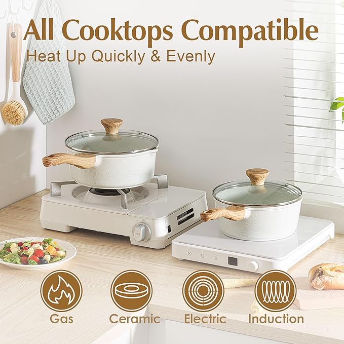- Suitable For All Stoves - High magnetic conductive stainless steel base allows the 3 qt saucepan with lid nonstick to work on all cooktops, including induction, glass stovetop. The core of sauce pan is made of cast aluminum, which is sturdy, long-lasting and heats up quickly and evenly.