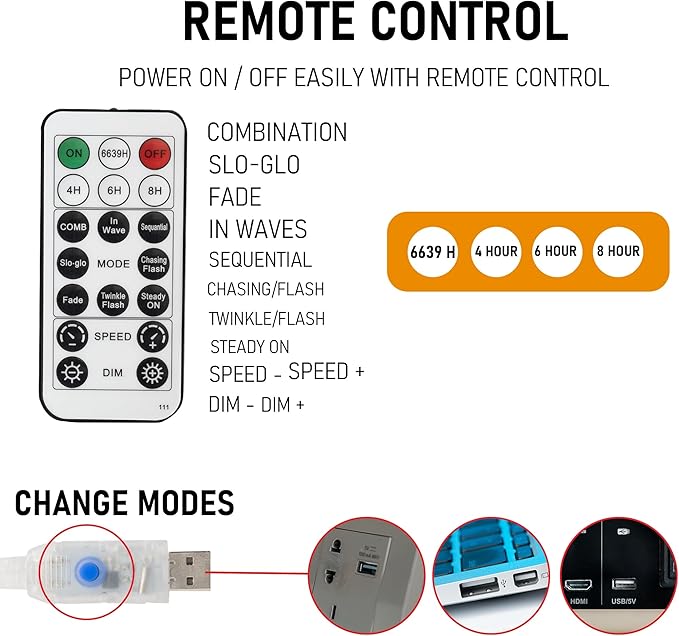 - Remote Control: Easily manage your lights with the included remote control, which allows you to turn the lights on and off, adjust brightness and speed, set 4H, 6H, and 8H timers, and change different lighting modes such as combination, slow glow, wave, sequential, chasing/flash, slow fade, twinkle/flash, and steady on.