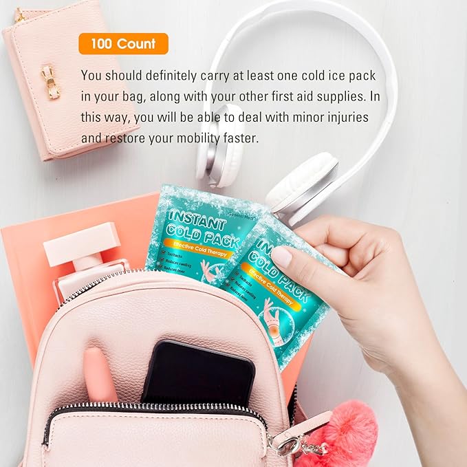 - Suitable size - Disposable ice packs come in packs of 100, and they are 4"x 5.5" inches each. Thanks to their practical size, you can use these cold ice packs on any part of your body, including your ankle, elbow, head, neck, hip, foot, wrist, knee, calf and shoulder.