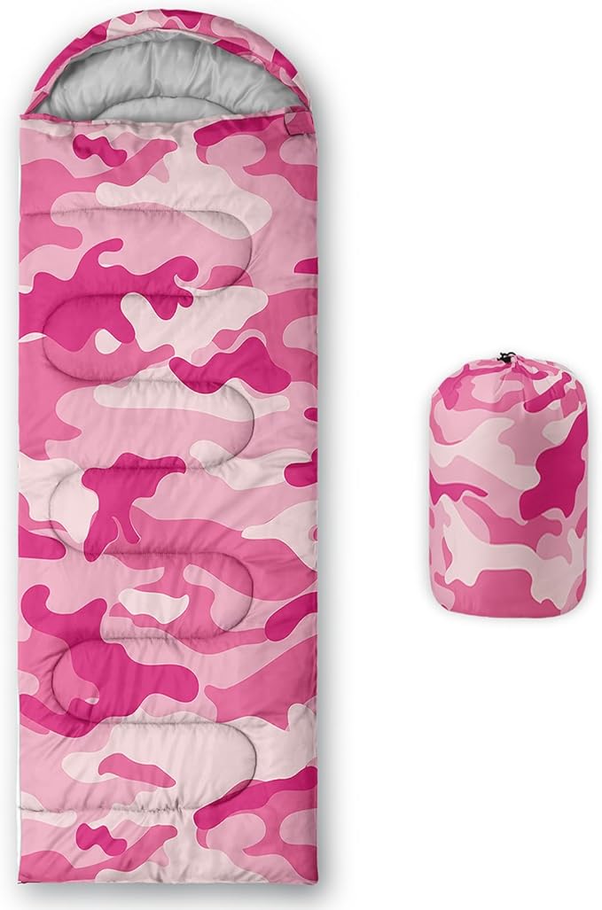 - Premium Material - The camping sleeping bag is made of premium 220T ripstop microfiber fabric,comfortable and breathable,lined with 220T cotton pongee. The waterproof outer protective shell is made of a unique hexagonal design and high-quality Material with double S-stitching and microfiber filling for optimal warmth and insulation to protect you from the elements. The bright colors are loved by boys and girls,great for kids and adults alike!