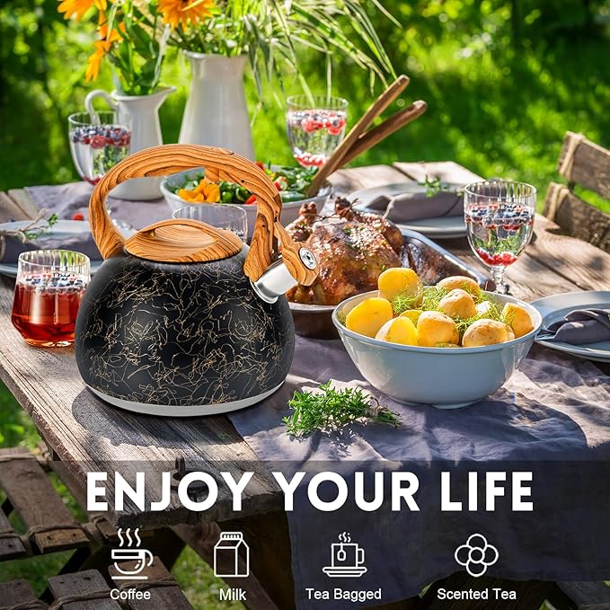 - 【High-Grade Design】 GGC tea kettle is made of heavy stainless steel, starry black color kettle body, design with gold art line appearance and wood pattern color handle, making your tea kettle more unique, elegant and high-grade
