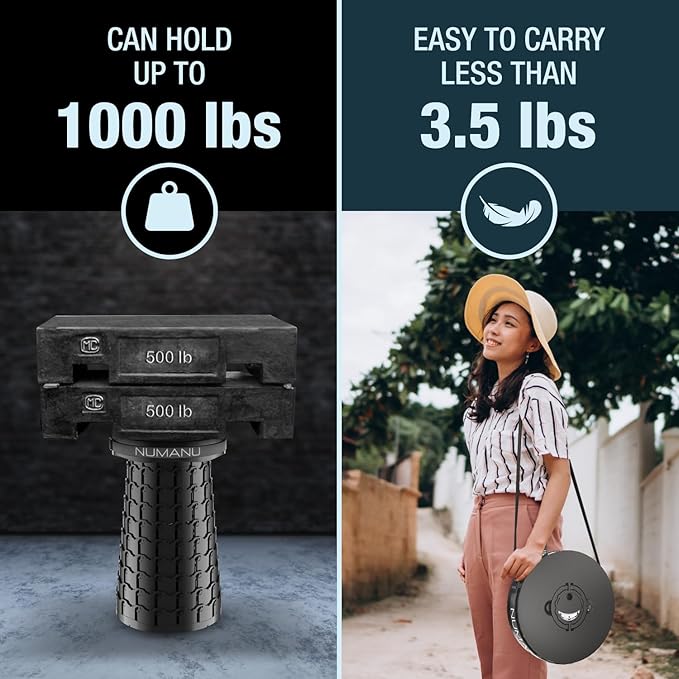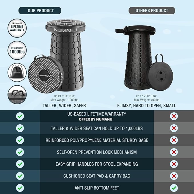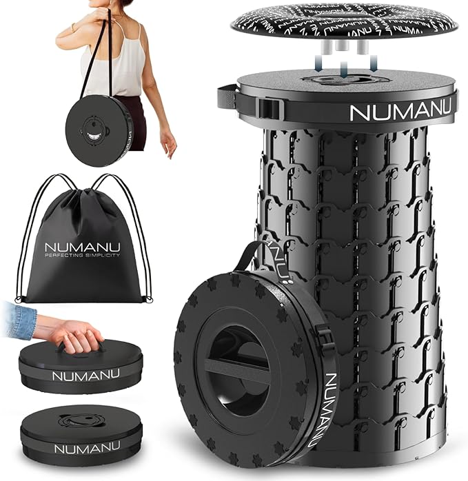 - 🆕【2025 UPGRADED, US-PATENTED, TALLER & WIDER XXL STOOL】Patented XXL Heavy Duty version of the popular Portable Collapsible Stool Telescopic Seat Camping Chair - 19.7" Tall & 11.8" Wide surpasses other Folding Stools on the market. NUMANU, a US-based seller - provides a safer, sturdier and more comfortable seating experience backed by a Lifetime Manufacturer's Warranty for your Retractable Folding Stool.