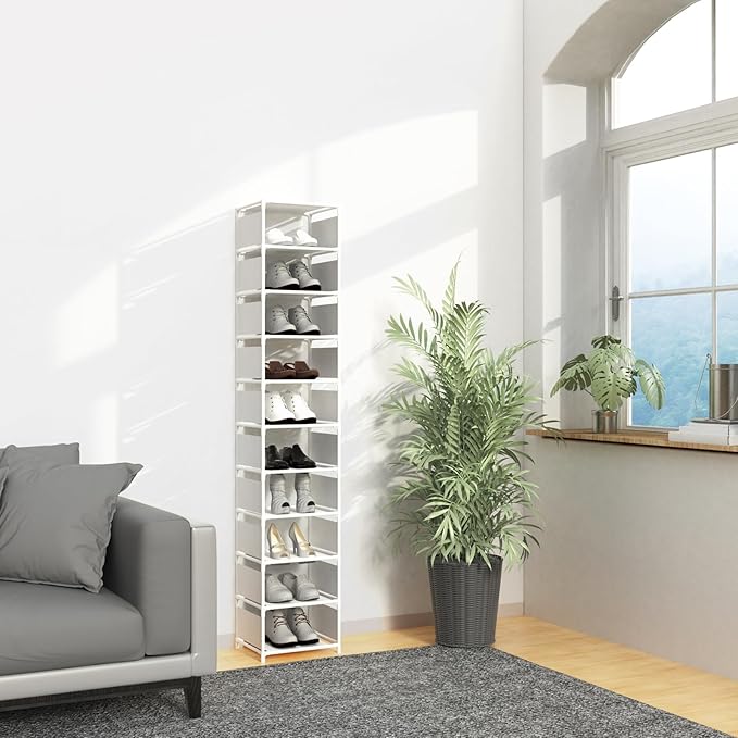 Narrow Shoe Rack, 10 Tier Vertical Shoe Rack for Closet Entryway, White Tall Slim Shoe Tower for Small Spaces, Shinky Shoe Organizer, Space Saving Corner Shoe Shelf