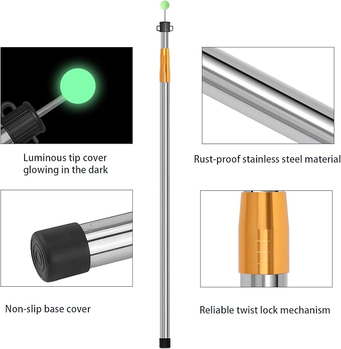 - 【Non-slip & Luminous】The metal tent tip with a removable newest luminous tip cover, glow in the dark. Note: The glow-in-the-dark caps on the pole tips are soft and couldn't support a tarp that's too heavy, so it's recommended that you use the pole tips to go through the tent grommets and then fix the tent with the tip caps.