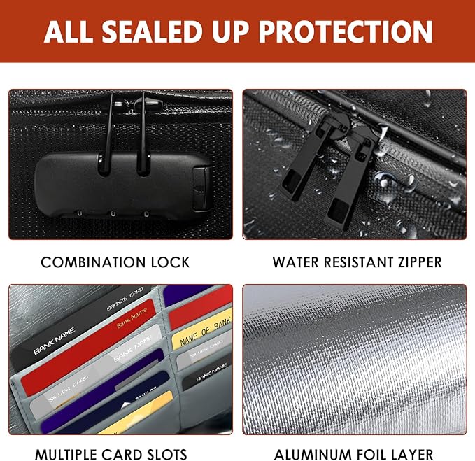 - [UPGRADED 6400°F FIREPROOF & WATER-RESISTANT BAG]: Enhance the protection of your documents, cash bag, money safe with our FIREPROOF BAG. Designed as a versatile fireproof document bag, it incorporates a 12-LAYER STRUCTURE for exceptional heat insulation, capable of withstanding temperature up to 6400°F (UL94 VTM-0) in certain times. This document safe fireproof money bag for cash/ fireproof safe for documents is a trusted choice for safeguarding your valuables.