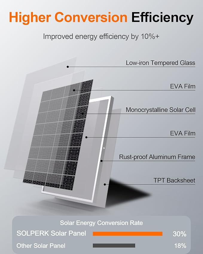 - Higher Efficiency & Durable: This solar panel charger is powered by high-efficiency monocrystalline silicon cells with a conversion rate of up to 30%, allowing you to charge faster. The corrosion-resistant aluminium frame and toughened glass coating ensure resistance to weathering and wear and tear, and the IP67 waterproof certification means it stands up to all weather conditions. Built to last with a 25-year lifespan, allowing you to enjoy reliable and stable green energy for a long time