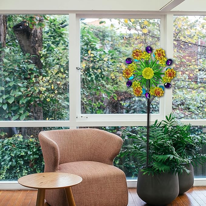 - 【SPECIAL SHAPE DESIGN】Yellow florets and purple jewelry design metal garden windmill, Garden spinner is painted with yellow pigment, and Sparkling purple jewelry. Beautiful outdoor windmills,whether stationary or in motion,are the perfect addition to your outdoor garden area and can add color to your yard and lawn. When it starts to rotate, it will be like countless flower blooming in the wind, bringing your garden to life