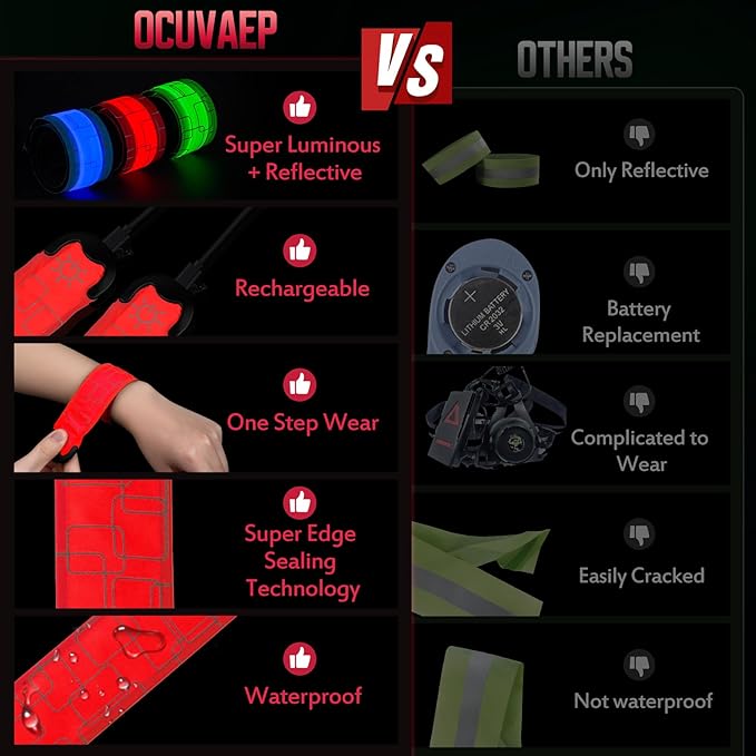 • 【USB Rechargeable】Unlike most LED armbands that require frequent battery replacements, our LED armband for running comes with a rechargeable, long-lasting battery for superior performance and practicality. The night running gear charges up fairly quickly. It only requires a 2-3 hour charge and can function for 6 - 8 hours, with a fairly long battery life. Red light means charging, blue light means fully charged.