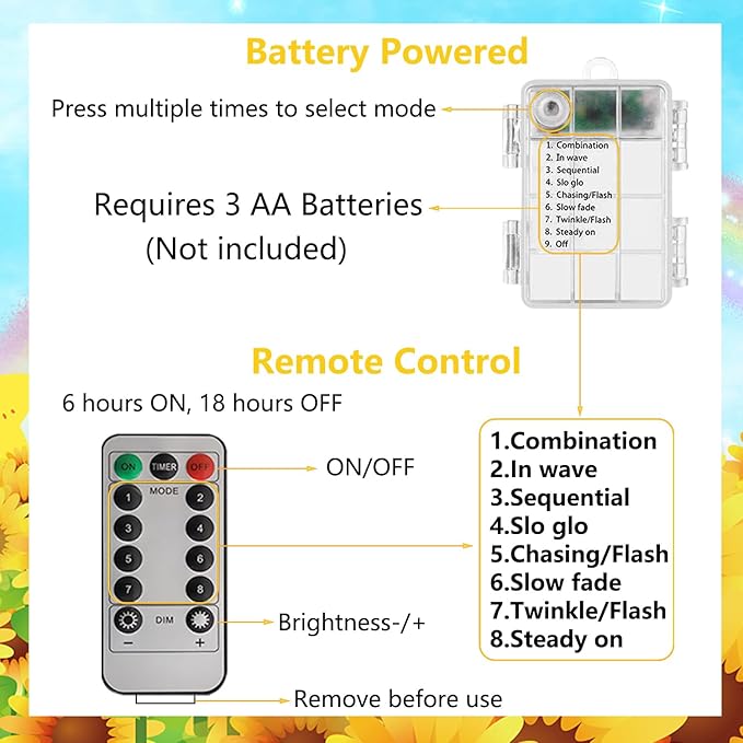 - 2.String Lights with Remote Control - Point the remote to the string lights, you can control the lights ON, OFF and lighting modes. And there are 8 different modes (combination, sea wave, sequence, Slo-Glo, chase/flash, slow fade in, blink/flash, steady light up) can be controlled by the button on the battery box.