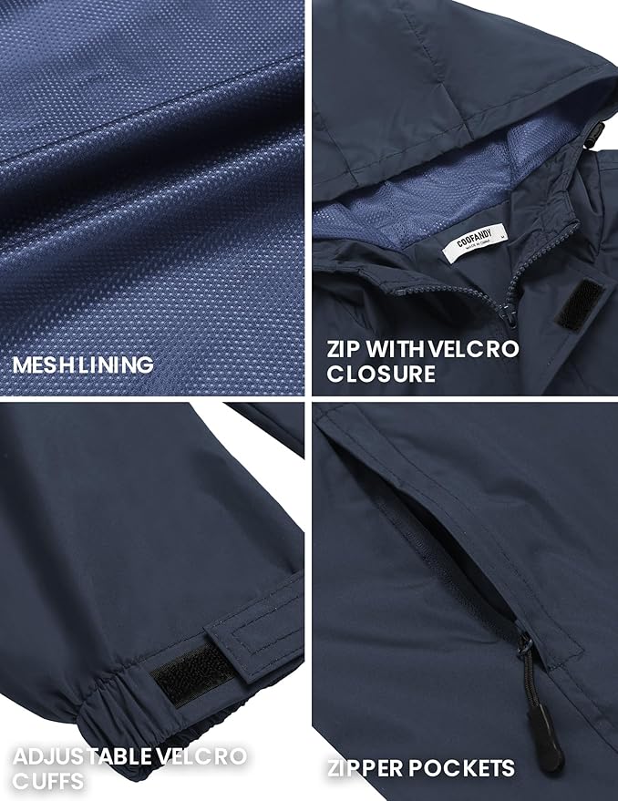 - [Waterproof & Windproof] COOFANDY mens rain jacket features water-resistant fabric full heat seam-sealed construction to allows you to dry completely even during downpour rain. Hooded hiking rain coat featured 2 zipper pockets, drawcord adjustable hood and the velcro on the cuffs and zipper, hew with drawstring and breathable mesh fabric.