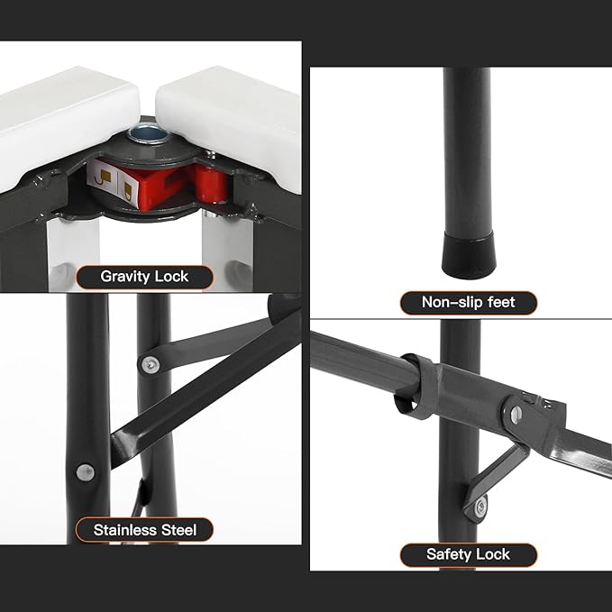 - ๐ใSturdy Supportใ The Picnic Table with Powder-coated steel legs, the camping table frame joint locks, and non-slip rubber feet help to keep the plastic table in place during every event.