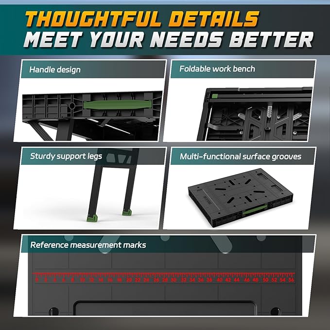 - [Multi-Scene and Multi-Function]:This work benches for garage is suitable for any scenario, with a wide work table for a variety of applications. Foldable work benches for garage adapts perfectly to a variety of tasks and settings, making your work more efficient and enjoyable.