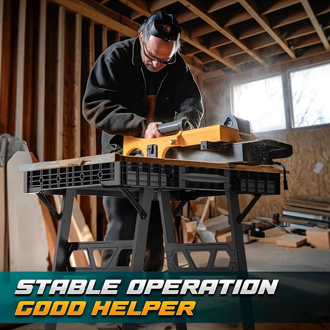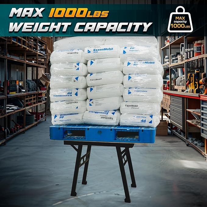 - [Sturdy and Lightweight]:4 sturdy metal legs with bases ensure that the work table will not tip over when in use. With a max weight capacity of 1000 lbs, workbench can easily handle heavy-duty tasks. But foldable work table only weighs 23lb.
