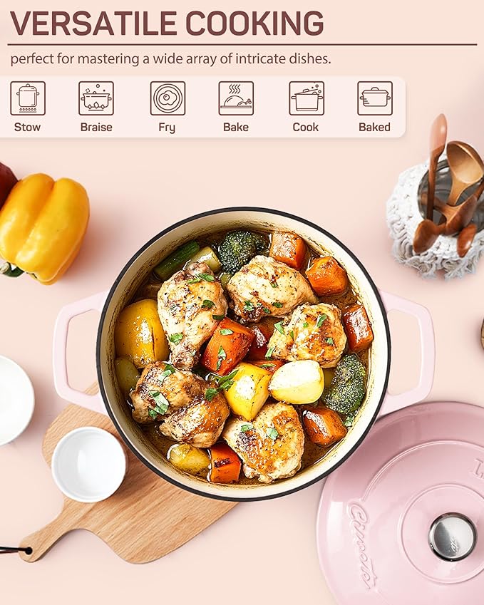 - Stylish & Functional Design: Combining practical functionality with elegant design, the cast iron dutch oven is a beautiful addition to any kitchen. Available in various colors and featuring an elegant shape, it enhances your cooking experience and adds a stylish touch to your kitchen decor.