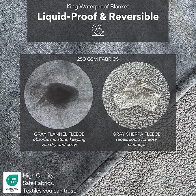 - King size blanket with ultimate moisture barrier. Waterproof bed cover shields the surface beneath from spills, leaks, and accidents—whether on your bed, couch, or favorite cozy spot. Say goodbye to wet spots and hello to dry, dependable comfort.